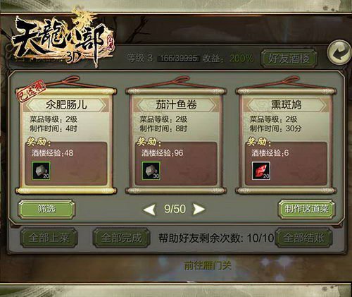 《天龍八部3D》手遊中酒樓能夠取得腰帶,特點藥,經歷和金幣,製造菜品能夠增加酒樓的等級,越高取得東西越多。每個玩家都運營著一家酒樓。