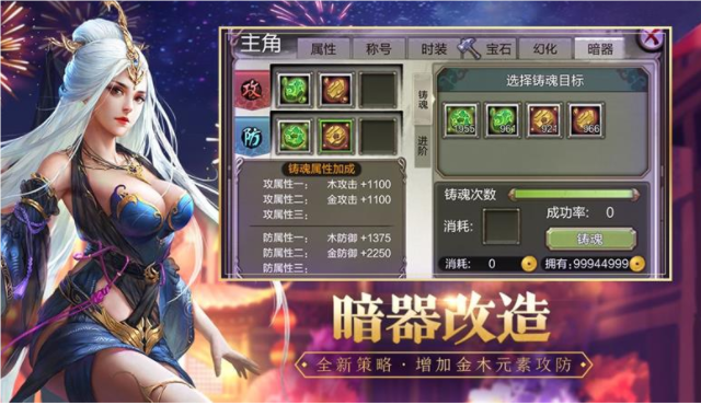 新增四種全新的元素特點【金進犯】【金防護】【木進犯】【木防護】,運用對應魂石進行鑄魂操作後就能夠取得該特點。原有的暗器鑄魂槽位由4個添加至6。 包括壹個進犯型槽位和壹個防護型槽位,本次暗器更新最重要的玩法是【暗器進階】,這些特點能夠經過消耗材料來取得成長,打造合這自己的五行特點。