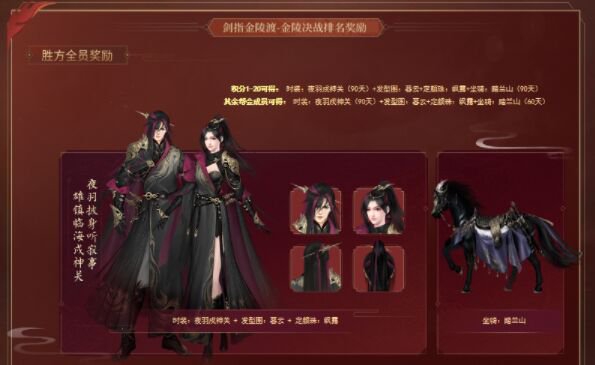 金陵城主福利【剑指金陵渡-决战】中胜利帮会的帮主,可将以下物品分配给本帮成员:【神品秘技:攻守兼备*2】、【金陵城主专属时装:苍龙御九州(永久)】