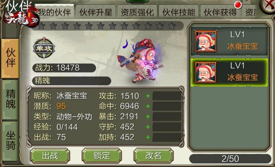 冰蠶寶寶除了外形極具特征,屬性也不差。潛質95的動物型同伴,基礎具有1510進犯,6946射中,2191暴擊和452的守護、加持,能為妳在战斗中增加助力!